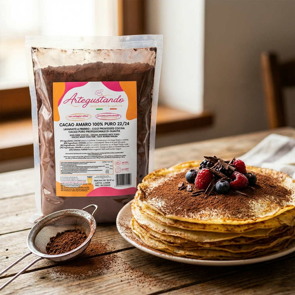 Il nostro cacao amaro 100% puro 22/24 è un cacao in polvere professionale lavorato a freddo (cold processed), ideale per pasticceria, gelateria e preparazioni artigianali di alta qualità.