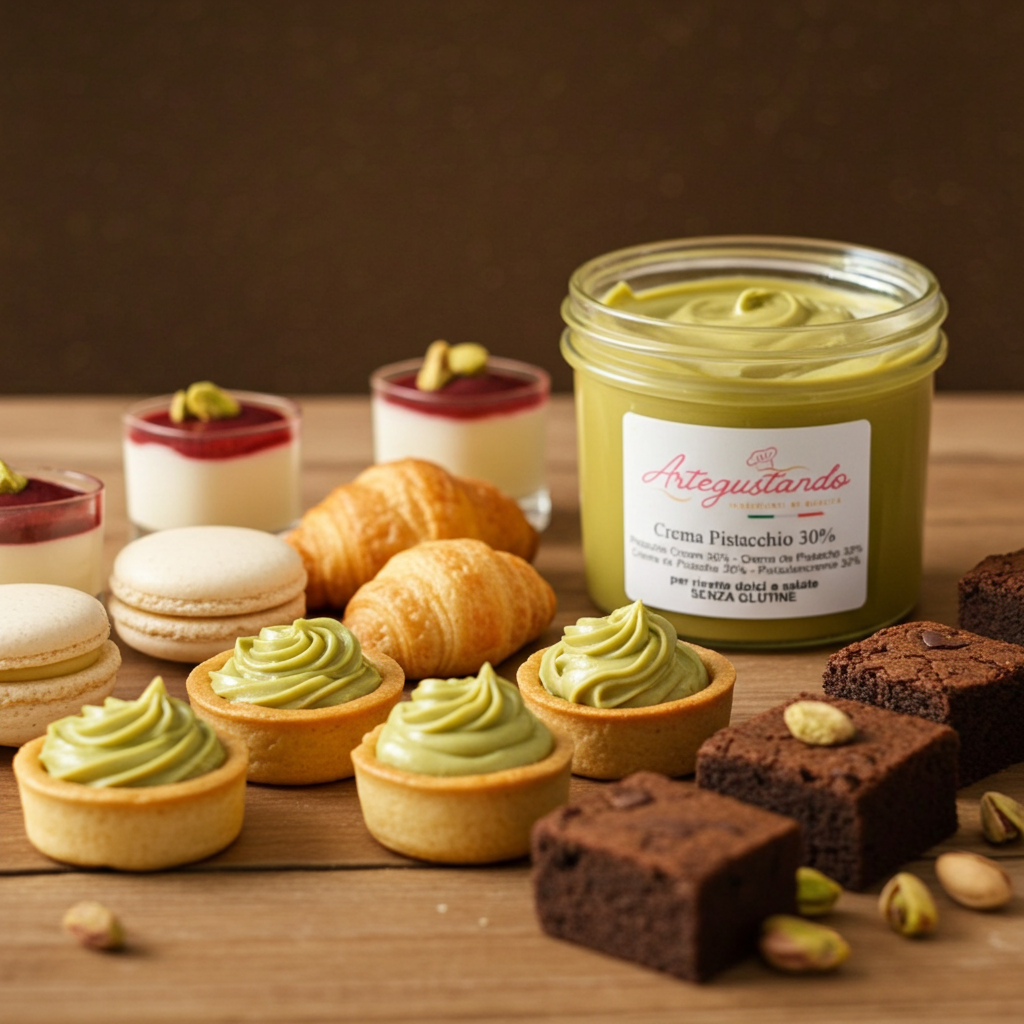 Crema spalmabile di pistacchio con il 30% di pistacchi all'interno, senza glutine, italiana. Prodotto professionale di altissima qualità.